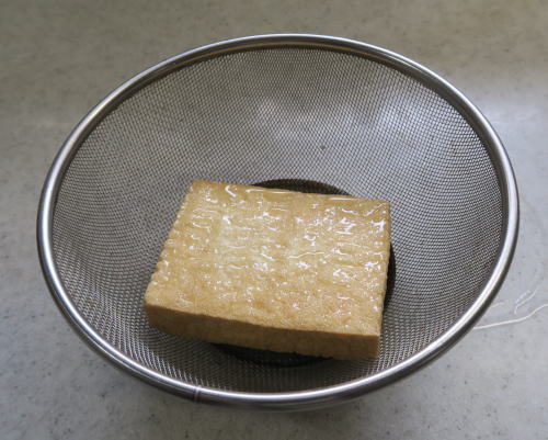 厚揚げ:1枚はザルにのせ、 両面に熱湯を回しかけ湯抜きをし、 |