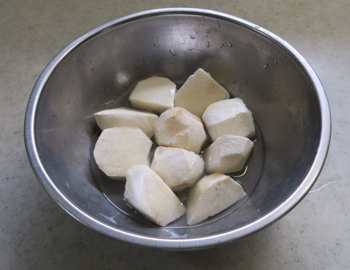 | 冷凍保存してあった里芋:約5個分を使いました。 ボウルに入れ塩:少々と水:大匙3を入れ混ぜて ぬめりが出たら一度洗って水を切ります。 |