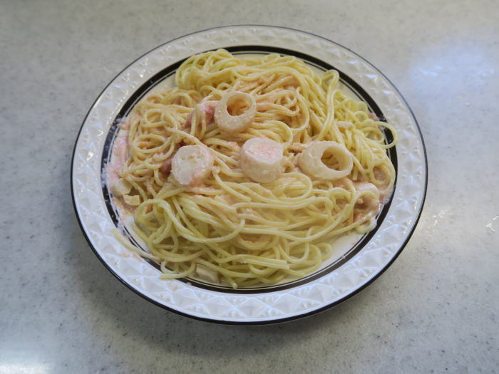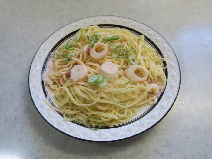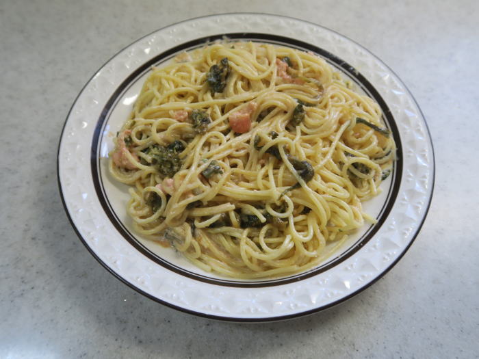 | 茹で上げたスパゲッティと和えれば出来上がりです。 初めての試みでしたが、病みつきになるおいしさです。 |