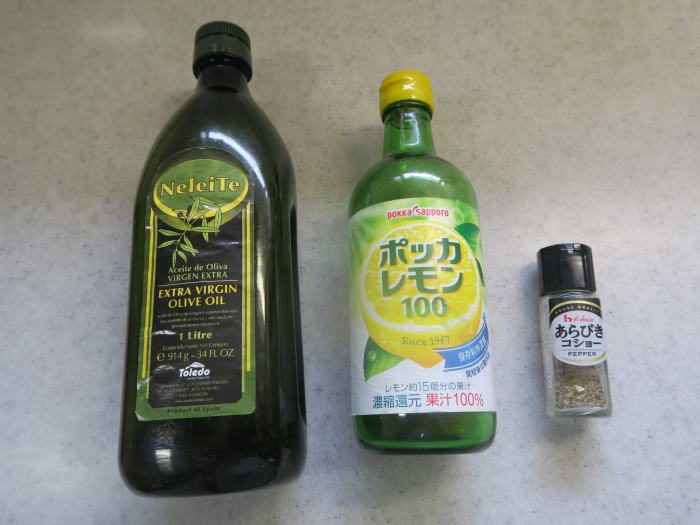 ボールに入れて、オリーブオイル:大匙1、 レモン汁:大匙1、塩:小さじ2分の1、 コショウ:少々で和えたら完成です。 |
