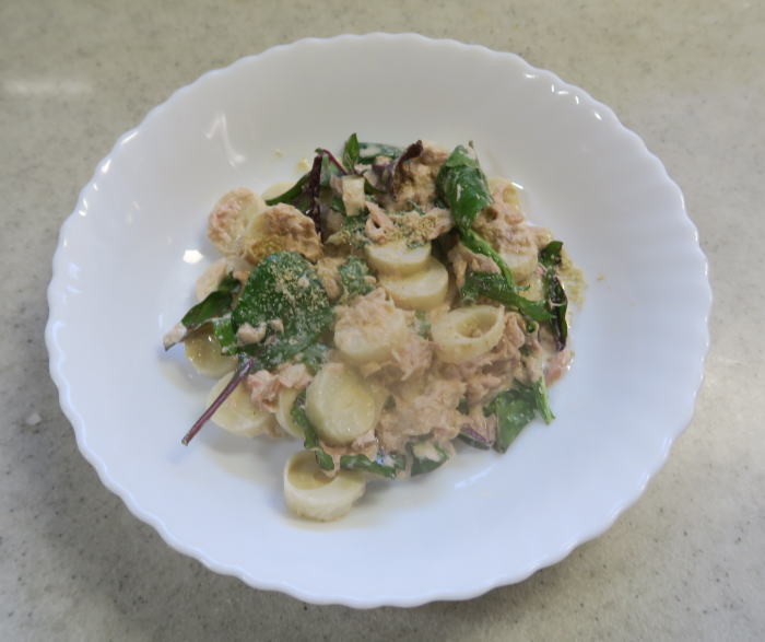 | 昼食に、時々作っている「たら子スパゲッティ」に 知人から戴いた「パルミット」を加えてみました。 五三竹(ごさんちく)のようなおいしい食感でした。 2026.03.12(木) |