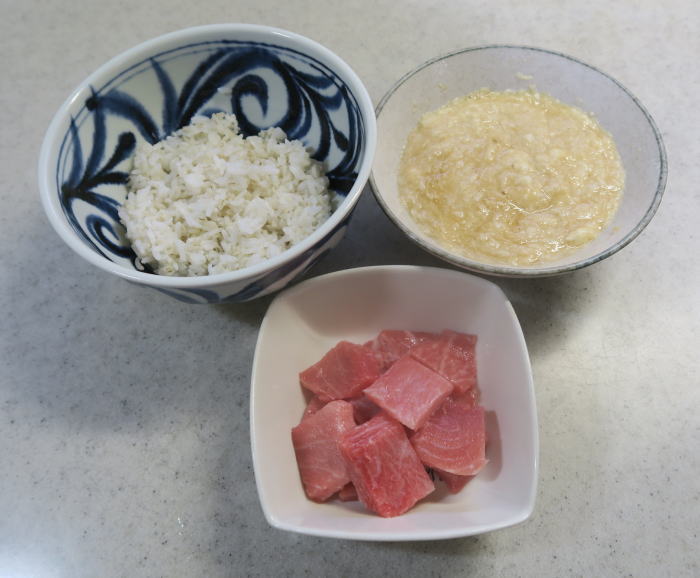 | 長芋に比べとても濃厚なおいしさです。 今度は「まぐろの山かけ丼」を作ります。 |