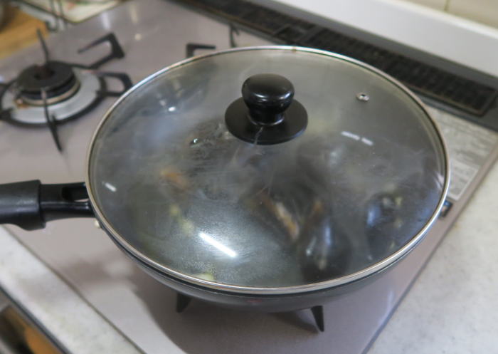 ムール貝を入れ、 白ワイン:80ccを入れたら、 |