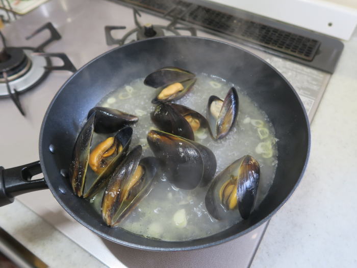 ムール貝の口が開いたら 塩コショウで味を調えて |
